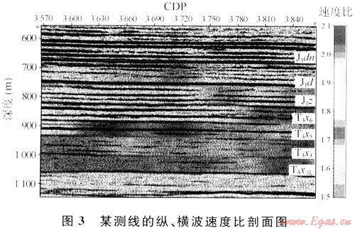 根據(jù)同一地層,縱波、橫波旅行時的差異,在層位匹配后可以得地層的平均縱、橫波速度比。由圖3可見,砂巖地層速度比大于泥巖速度比,清晰地分辨了砂泥層。