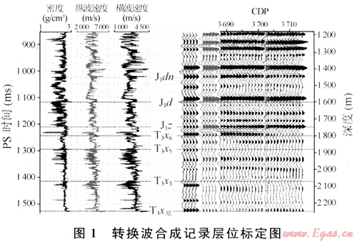 多波解釋首當其沖的問題便是轉換波的地質層位標定。它是多分量解釋最為關鍵的一環(huán),也是國內外公認的一個難點。圖1是利用GeoMountain解釋工程師軟件在縱波地質層位標定的基礎上對GA2井進行轉換波合成記錄地質層位的標定結果。