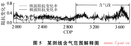 通過匹配的PP波和PS波剖面就得到了目的層段的PP波和PS波旅行時的對應關系,這是進行多波聯(lián)合反演的重要基礎。完成多波層位匹配方可進行多波聯(lián)合反演。多波聯(lián)合反演采用目的層位的PP波和PS波AVO效應來求取目的層位的彈性參數(shù)信息。因此首先拾取出目的層的AVO曲線(圖4)。為了將AVO曲線轉換為AVA曲線,利用PP波和PS波速度譜建立PP波和PS波的速度場,對速度比進行估計。經AVO正演方法對地震數(shù)據(jù)能量進行調整,最后由目的層頂界面PP波和PS波的AVO曲線反演了蓋層與儲層的縱波和橫波的阻抗變化率(圖5)。綜合工區(qū)井資料、地質資料進行分析,再由橫向上的阻抗變化率圖可見,在CDP2890附近特征明顯變化,左邊的阻抗變化率低于右邊的,但提高變化率較為明顯反映了目標儲層的含氣范圍,為此套儲層的開發(fā)提供了依據(jù)。
