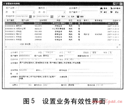 設(shè)置業(yè)務(wù)有效性界面見圖5,大慶燃?xì)饪蛻舴?wù)系統(tǒng)采用先進(jìn)的CTI技術(shù),友好的語音導(dǎo)航服務(wù)提高了服務(wù)質(zhì)量;電話接入后系統(tǒng)可自動(dòng)定位客戶,實(shí)現(xiàn)客戶數(shù)據(jù)與電話的同步轉(zhuǎn)移,大大提高了坐席的工作效率和服務(wù)水平;可實(shí)現(xiàn)客戶發(fā)送傳真的自動(dòng)接收,支持人工在線派發(fā)和處理,提高了效率,降低了運(yùn)營成本,可以滿足將來不斷發(fā)展的燃?xì)饪蛻魳I(yè)務(wù)需求。該系統(tǒng)的具體功能如下:
