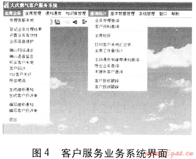 客戶服務(wù)業(yè)務(wù)系統(tǒng)界面見圖4,客戶服務(wù)業(yè)務(wù)系統(tǒng)具有呼叫管理、客戶服務(wù)業(yè)務(wù)管理、網(wǎng)上客戶服務(wù)、自動(dòng)語音通告、自動(dòng)傳真通告、自動(dòng)短信通告、分級(jí)授權(quán)查詢等功能。