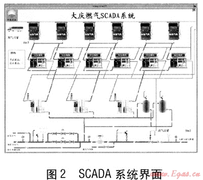 ② 數(shù)據(jù)存儲(chǔ)、分析和處理。SCADA系統(tǒng)界面見圖2,對(duì)高于上限或低于下限的實(shí)時(shí)數(shù)據(jù)做出超高、超低報(bào)警;根據(jù)需要提供生產(chǎn)數(shù)據(jù)報(bào)表,還提供趨勢(shì)圖,用以輔助分析用氣規(guī)律;系統(tǒng)提供了7種不同功能的使用權(quán)限,使操作員和維護(hù)人員可以根據(jù)使用需求更方便地進(jìn)行工作;系統(tǒng)具有事件記錄功能,無論是實(shí)時(shí)數(shù)據(jù)報(bào)警還是通信故障,一切信息都作為事件被記錄在系統(tǒng)中,以供日后查看。