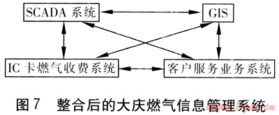 對(duì)于大慶燃?xì)釹CADA、GIS、客戶服務(wù)業(yè)務(wù)系統(tǒng)、IC卡燃?xì)馐召M(fèi)系統(tǒng),在建設(shè)初期即考慮到各系統(tǒng)對(duì)接、數(shù)據(jù)共享等系統(tǒng)間的整合問題。整合后的大慶燃?xì)庑畔⒐芾硐到y(tǒng)見圖7。