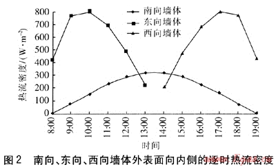 采用式(1)~(6)計(jì)算不凍泉地區(qū)2008年9月7日8:00—19:00墻體外表面向內(nèi)側(cè)的逐時(shí)熱流密度,南向、東向、西向墻體外表面向內(nèi)側(cè)的逐時(shí)熱流密度見圖2。
