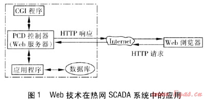 在采用基于Web技術(shù)用戶(hù)界面理念的熱網(wǎng)SCADA系統(tǒng)中,PCD控制器就代表了配備有圖形顯示功能的Web服務(wù)器。從根本上說(shuō),PCD控制器也是Web服務(wù)器,操作界面僅只是客戶(hù)端而已,這樣就簡(jiǎn)化了通信過(guò)程。而常規(guī)熱網(wǎng)SCADA系統(tǒng)所采用的現(xiàn)場(chǎng)控制器不具備Web服務(wù)器的功能。