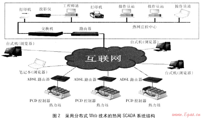 基于分布式Web技術(shù)的熱網(wǎng)SCADA系統(tǒng)的關(guān)鍵是建立Internet的連接從而訪問(wèn)PCD控制器,該工程每座熱力站都通過(guò)ADSL路由器將PCD控制器連接到Internet。