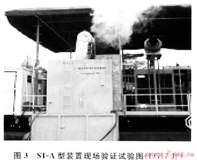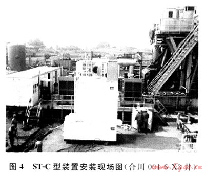 圖3是ST-A型裝置(單機(jī)配帶)在LG17井現(xiàn)場(chǎng)對(duì)比試驗(yàn)運(yùn)行實(shí)況,圖4是ST-C型裝置(三機(jī)配帶)在合川001-6-X3井現(xiàn)場(chǎng)安裝實(shí)況,均隨鉆井全周期同步運(yùn)行,取得了廢水源頭治理和廢氣消煙、降溫降噪的良好效果。