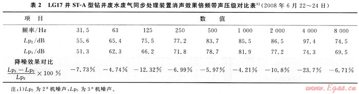 LG17井38機(jī)配帶ST-A型廢水廢氣同步消減裝置與2#機(jī)對(duì)比,排氣背壓(表1)與噪聲(表2)同步下降。鉆進(jìn)工況為柴油機(jī)轉(zhuǎn)速1200r/min,2#機(jī)排氣背壓實(shí)測(cè)值2.3~2.5kPa,3#機(jī)僅660Pa,降低70%以上。該工況下按噪聲監(jiān)測(cè)規(guī)范在3個(gè)方位分別檢測(cè)單開(kāi)3#機(jī)和單開(kāi)2#機(jī)的噪聲頻譜(表2),3#機(jī)倍頻帶消聲效果均優(yōu)于2#機(jī),2kHz以上高頻段降噪效果更明顯,4kHz降幅達(dá)最大值-23.7%。