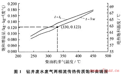 根據(jù)氣液兩相流直接接觸傳熱傳質(zhì)等焓過(guò)程原理[9],設(shè)柴油機(jī)排氣溫度(t)、濕含量(H)、比熱(Cp),與廢水傳熱傳質(zhì)達(dá)到飽和溫度(ts)、飽和濕含量(Hs),廢水汽化熱(γ),則單位質(zhì)量廢氣飽和增濕量理論值為: