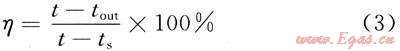 圖1的t-ts曲線還提供了與柴油機(jī)排氣溫度(t)相對(duì)應(yīng)的飽和溫度(ts),若實(shí)測(cè)同步處理后廢氣溫度下降到tout,則根據(jù)式(3)定義的設(shè)備運(yùn)行效率可判斷運(yùn)行狀態(tài),一般應(yīng)在90%~98%范圍。