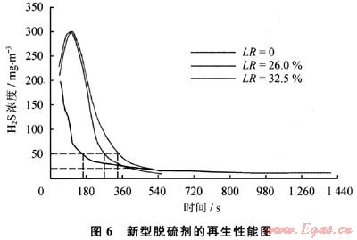 由圖6可以看出,新脫硫劑再生時(shí)有較寬的高濃度區(qū),硫化氫脫除效率高,而硅膠則基本不存在高濃度區(qū),而且硅膠脫硫劑再生曲線拖尾長,1400s左右時(shí)再生氣硫化氫含量仍達(dá)17.6mg/m3,而LR為26%的新脫硫劑在550s左右時(shí),硫化氫含量就降到11.7mg/m3??梢?,涂漬適當(dāng)濃度的涂漬液也可以明顯改變脫硫劑的再生性能。