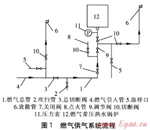 燃?xì)夤庀到y(tǒng)流程見圖1。燃?xì)夤艿涝谕V惯\(yùn)行進(jìn)行檢修時(shí),為檢修工作安全,需要管道內(nèi)的燃?xì)獯祾吒蓛簟O到y(tǒng)在較長(zhǎng)時(shí)間停止工作后再投入運(yùn)行前,也需要進(jìn)行吹掃。因此,在鍋爐房供氣系統(tǒng)設(shè)計(jì)中,應(yīng)設(shè)置吹掃和放散管道。放散管出口應(yīng)高出屋脊2m以上。由鍋爐房外部引入的燃?xì)饪偣?,在進(jìn)口處應(yīng)裝設(shè)燃?xì)饪偳袛嚅y,按燃?xì)饬鲃?dòng)的方向,閥前應(yīng)裝放散管,并在放散管上裝設(shè)取樣口,閥后應(yīng)裝吹掃管。為保證鍋爐安全可靠運(yùn)行,要求供氣管和其他管道上安裝的附件連接嚴(yán)密可靠,能承受最高使用壓力,且不得裝設(shè)在高溫和有危險(xiǎn)的地方[3、4]。