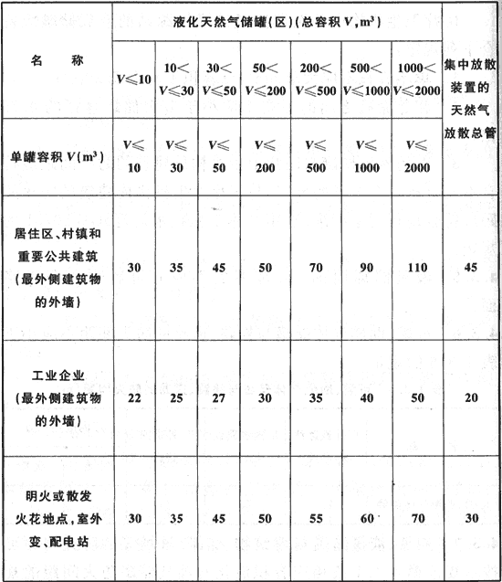 4.3.8 液化天然氣氣化站的液化天然氣儲(chǔ)罐(區(qū))與站外建筑等的防火間距不應(yīng)小于表4.3.8的規(guī)定,與表4.3.8未規(guī)定的其他建筑的防火間距,應(yīng)符合現(xiàn)行國(guó)家標(biāo)準(zhǔn)《城鎮(zhèn)燃?xì)庠O(shè)計(jì)規(guī)范》GB 50028的規(guī)定。