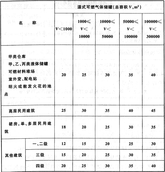 表4.3.1 濕式可燃?xì)怏w儲(chǔ)罐與建筑物、儲(chǔ)罐、堆場(chǎng)等的防火間距(m)