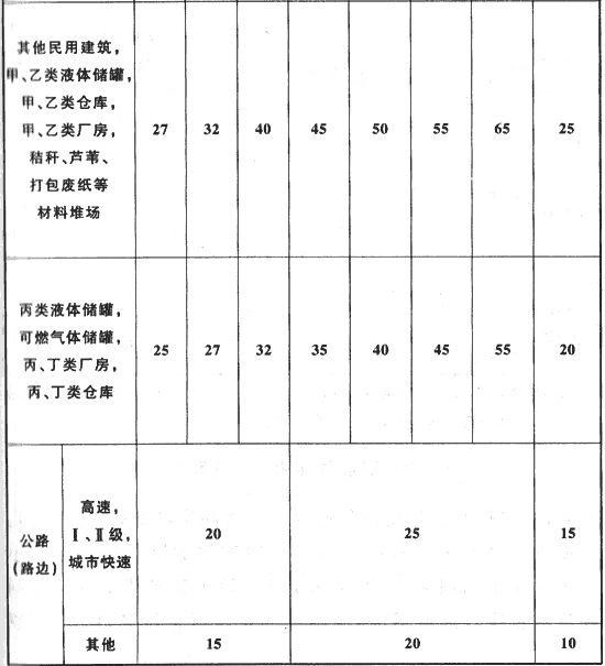 注:居住區(qū)、村鎮(zhèn)指1000人或300戶及以上者;當(dāng)少于1000人或300戶時(shí),相應(yīng)防火間距應(yīng)按本表有關(guān)其他民用建筑的要求確定。