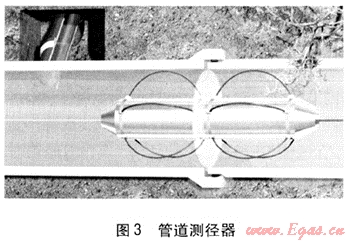 測徑器檢測法目前在石油管道、海底管道工程中應(yīng)用較多,而且技術(shù)也比較成熟,但檢測精度有待提高。另外一類測徑檢測法是使用一種類似于清管器的裝置,它利用介質(zhì)推動在管道內(nèi)通行,可檢測管道內(nèi)凹陷、橢圓變形、環(huán)焊縫周長、壁厚變化等。常通過評估軟件將管道內(nèi)凹陷或橢圓變形超過一定指標(biāo)的部位及數(shù)據(jù)以列表形式或圖形方式顯示出來。