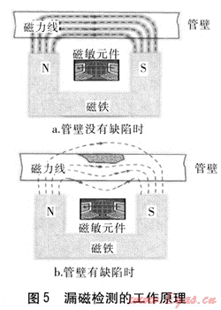 漏磁檢測技術(shù)建立在鐵磁材料的高磁導(dǎo)率特性之上,其工作原理見圖5。當(dāng)檢測裝置在管道內(nèi)行走時(shí),通過檢測器所攜帶的強(qiáng)力永久磁鐵將管道磁化,使管道上產(chǎn)生一個(gè)縱向的磁場回路。當(dāng)管壁無缺陷時(shí),磁力線絕大部分通過管壁,此時(shí)磁力線均勻分布;當(dāng)管壁有缺陷時(shí),磁力線發(fā)生彎曲,并且有一部分的磁力線穿出管壁以外產(chǎn)生漏磁。通過檢測和分析逸出管壁的漏磁通量,就可以確定管道金屬損失的程度以及位置。