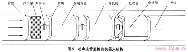 超聲波檢測法是利用超聲波的脈沖反射原理,通過超聲波在介質(zhì)中傳播時(shí)遇金屬表面發(fā)生部分反射的特性來測定管道的壁厚及管內(nèi)表面狀況的一種方法。管道內(nèi)檢測使用的超聲波檢測儀為管道內(nèi)通行的檢測機(jī)器人,超聲波管道檢測機(jī)器人是一種能夠遠(yuǎn)程控制、在管道內(nèi)行走、裝載有超聲波傳感器件的機(jī)構(gòu)(見圖4)[4]。檢測機(jī)器人由液體推動,由多節(jié)功能艙組成。主要包括探頭架、萬向節(jié)、皮碗、控制器艙、計(jì)算機(jī)艙、里程輪、電池艙、天線等。探頭架內(nèi)安裝有環(huán)向陣列超聲波檢測器,是檢測管道壁厚數(shù)據(jù)的來源;艙與艙之間以萬向節(jié)連接,便于通過管道轉(zhuǎn)彎部分;多個(gè)皮碗實(shí)現(xiàn)檢測裝置的密封;控制器艙內(nèi)安裝控制整套機(jī)構(gòu)動作的執(zhí)行元件;計(jì)算機(jī)艙負(fù)責(zé)接收外部指令并向控制器艙發(fā)送動作指令;里程輪用于計(jì)算從管道入口開始行走的距離;電池艙給管道內(nèi)整套檢測裝置供電;天線負(fù)責(zé)檢測機(jī)器人與地面控制裝置的通信。