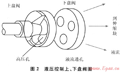 調(diào)制式旋轉(zhuǎn)導(dǎo)向鉆井工具(MRST)屬于推靠式旋轉(zhuǎn)導(dǎo)向鉆井工具(圖1)。由于其鉆柱與井壁之間不存在靜止點(diǎn),因此,在鉆井過(guò)程中更可體現(xiàn)旋轉(zhuǎn)鉆井的優(yōu)越性[1]。調(diào)制式旋轉(zhuǎn)導(dǎo)向鉆井系統(tǒng)導(dǎo)向力的大小和方向主要是由穩(wěn)定平臺(tái)控制的。當(dāng)需要最大導(dǎo)向力時(shí),穩(wěn)定平臺(tái)控制軸就帶動(dòng)上盤閥旋轉(zhuǎn),使上盤閥穩(wěn)定在預(yù)定方向,控制上盤閥高壓孔方向恒定。在鉆柱旋轉(zhuǎn)過(guò)程中,每個(gè)“巴掌”依次在該方向附近伸出拍打井壁,導(dǎo)向機(jī)構(gòu)對(duì)井壁的作用力就是這些拍打力的合力。這個(gè)合力的反力就是鉆柱受到的導(dǎo)向力,方向沿著上盤閥預(yù)定方向的反方向。當(dāng)不需要導(dǎo)向時(shí),穩(wěn)定平臺(tái)帶動(dòng)上盤閥以和鉆柱具有不同的某一轉(zhuǎn)速勻速轉(zhuǎn)動(dòng),這時(shí)“巴掌”均勻拍打井壁四周,導(dǎo)向工具可控制的液壓導(dǎo)向力的合力就等于零,此時(shí)導(dǎo)向工具呈中性工作狀態(tài),達(dá)到穩(wěn)斜效果。MRST液壓控制閥采用上、下盤閥結(jié)構(gòu),上盤閥與穩(wěn)定平臺(tái)控制軸相連接,它只有一個(gè)弧形長(zhǎng)孔形狀的高壓閥孔。下盤閥與鉆柱本體連接,隨MRST外殼及鉆柱一起旋轉(zhuǎn),它有3個(gè)互成120°圓心角的等直徑低壓孔(泄流孔),見圖2。