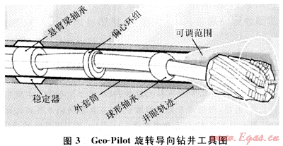 Geo-Pilot[2~3]是一種不旋轉(zhuǎn)套式導(dǎo)向工具(圖3),屬于指向式旋轉(zhuǎn)導(dǎo)向鉆井工具。它不是靠偏心穩(wěn)定器的翼肋推靠井壁偏置鉆頭進(jìn)行導(dǎo)向,而是靠不旋轉(zhuǎn)套與萬(wàn)向短節(jié)之間的一套偏心機(jī)構(gòu)使萬(wàn)向軸偏置,從而為鉆頭提供了一個(gè)與井眼軸線不一致的傾角,產(chǎn)生導(dǎo)向作用。該機(jī)構(gòu)由幾個(gè)可控制的偏心環(huán)組合而成,當(dāng)井下自動(dòng)控制完成偏心環(huán)組合之后,該機(jī)構(gòu)將相對(duì)于不旋轉(zhuǎn)套固定,從而始終將萬(wàn)向軸向固定方向偏置,為鉆頭提供一個(gè)方向固定的傾角。
