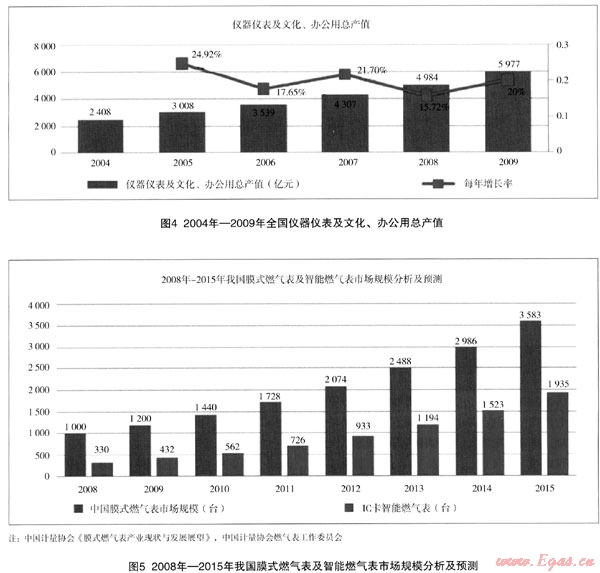 近幾年,我國儀器儀表及文化、辦公用行業(yè)發(fā)展迅速,2009年我國儀器儀表及文化、辦公用總產(chǎn)值達(dá)到5977億元。根據(jù)第5次全國人口普查數(shù)據(jù),我國共有家庭3.48億戶,城鎮(zhèn)人口約占總?cè)丝诘?5.68%,因此推算我國城鎮(zhèn)家庭約有1.58億戶。靜態(tài)地估計(jì),國內(nèi)民用燃?xì)獗淼氖袌?chǎng)容量約為1.5億臺(tái),目前我國處于傳統(tǒng)燃?xì)獗硐蛑悄苋細(xì)獗淼霓D(zhuǎn)換階段,IC卡燃?xì)獗?、無線燃?xì)獗砗虶PRS遠(yuǎn)程燃?xì)獗O(jiān)控抄表系統(tǒng)將成為主要產(chǎn)品。根據(jù)國家計(jì)量檢定規(guī)程~JJG577—2005《膜式燃?xì)獗怼芬?guī)定:以天然氣為介質(zhì)的燃?xì)獗硎褂闷谙抟话悴怀^10年,以人工燃?xì)?、液化石油氣等為介質(zhì)的燃?xì)獗硎褂闷谙抟话悴怀^6年。因此燃?xì)獗?/span>行業(yè)是一個(gè)持續(xù)發(fā)展的行業(yè),未來的市場(chǎng)前景廣闊。保守的估計(jì),2008年以后國內(nèi)每年更新或新安裝的燃?xì)獗?000萬臺(tái)以上,其中智能燃?xì)獗碚嫉?0%以上。預(yù)計(jì)2010年以后國內(nèi)市場(chǎng)對(duì)燃?xì)獗淼哪晷枨罅靠蛇_(dá)1500萬臺(tái)以上,其中智能燃?xì)獗韺⒄伎傂枨蟮?0%左右,而且需求量呈逐年上升的趨勢(shì),每年的增長(zhǎng)率可達(dá)30%~35%。到2015年中國燃?xì)獗淼目傂枨罅靠蛇_(dá)到3500萬臺(tái)~3700萬臺(tái)左右,其中智能燃?xì)獗砑s占總需求量的50%~55%左右。本公司產(chǎn)品自1998年投放市場(chǎng)以來,大量的在線產(chǎn)品已經(jīng)進(jìn)入更換期,因此在未來智能燃?xì)獗砀鼡Q市場(chǎng)中將釋放出巨大的市場(chǎng)潛力。