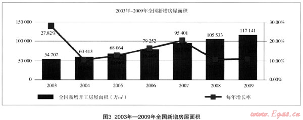 燃?xì)獗順I(yè)務(wù)與房產(chǎn)市場(chǎng)發(fā)展密切相關(guān)。2003年—2009年建筑房屋施工面積由259377萬m2增加到588593萬m2,年均增長(zhǎng)14.6%。