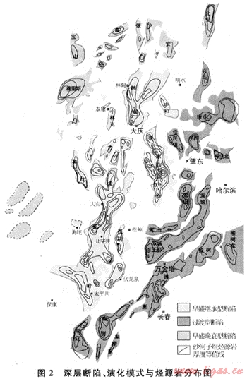 深層斷陷按受后期改造程度的強弱存在3種演化模式,即早盛繼承型、過渡型和早盛晚衰型(圖2):①早盛繼承型斷陷地層發(fā)育齊全,厚度大,后期改造弱,天然氣保存條件好,典型斷陷有林甸、古龍、長嶺、孤店、徐家圍子等;②過渡型斷陷地層發(fā)育較齊全,厚度較大,但后期改造強,有層位強烈的剝蝕或褶皺,天然氣保存條件相對較差,典型斷陷有雙城、王府、德惠、梨樹等;③早盛晚衰型斷陷地層發(fā)育不齊全,斷陷后期一直處于隆升狀態(tài),地層沉積厚度薄,并有層位缺失,這類斷陷中烴源巖成熟度均不高,典型斷陷有梅里斯、富裕、北安等。不同類型的斷陷中天然氣富集特征不同,早盛繼承型斷陷中天然氣最富集,聚集了深層95%的天然氣探明儲量。