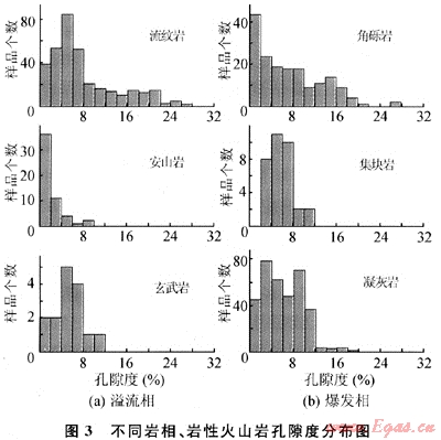 火山巖儲層形成受多因素的控制。火山巖相控制了儲層原生孔隙和原生裂縫,是好儲層形成的基礎,爆發(fā)相為火山巖相最有利的相帶。對979塊火山巖樣品的孔隙度進行統(tǒng)計顯示:爆發(fā)相優(yōu)于溢流相;爆發(fā)相中角礫巖的物性最好,凝灰?guī)r次之(圖3)。