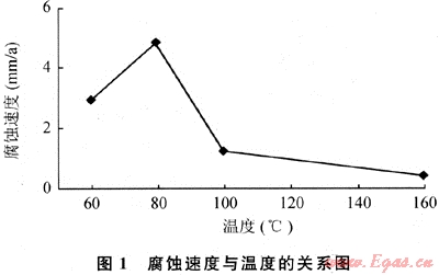根據(jù)徐深氣田4口氣井(徐深1-1、徐深1、徐深5、徐深6井)的水質(zhì)特征,配制了實(shí)驗(yàn)溶液。通過(guò)實(shí)驗(yàn)發(fā)現(xiàn):隨著溫度的升高,CO2腐蝕速度增加,當(dāng)達(dá)到80℃時(shí),腐蝕速度達(dá)最大值;超過(guò)80℃后,可能形成的腐蝕產(chǎn)物更加致密,從而導(dǎo)致腐蝕速度逐漸減??;到160℃后,腐蝕速度更小(見(jiàn)圖1)。根據(jù)上述實(shí)驗(yàn)結(jié)果,制定了徐深氣田徐家圍子區(qū)塊腐蝕環(huán)境參數(shù)實(shí)驗(yàn)條件:溫度80℃,CO2分壓2.0MPa。實(shí)驗(yàn)采用了美國(guó)Cortest公司生產(chǎn)的動(dòng)態(tài)高壓釜,流速2.5m/s,經(jīng)過(guò)24h、48h和96h動(dòng)態(tài)實(shí)驗(yàn),利用失重法計(jì)算試片腐蝕速率。