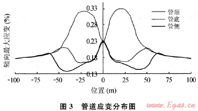 穿越該斷層的管道主要受軸向拉伸應力作用,因而可在只控制管道軸向最大拉伸應變情況下分析各參數(shù)對管道應變的影響。管道軸向坐標建立在管道穿越斷層處。在斷層作用下管道的應變分布見圖3,從圖上可以看到管道最大應變出現(xiàn)在斷層兩側(cè)30m范圍內(nèi)。