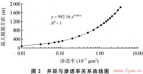 統(tǒng)計(jì)分析下白堊統(tǒng)營(yíng)城組三段160塊氣層巖心分析數(shù)據(jù),平均孔隙度10.2%,空氣滲透率1.117×10-3μm2,對(duì)應(yīng)的啟動(dòng)壓力梯度為0.0459MPa/m,由此推算,到氣田廢棄時(shí),最大泄氣半徑為524m,對(duì)應(yīng)的平均最大極限井距為1048m(圖2)。考慮Ⅱ、Ⅲ類(lèi)儲(chǔ)層天然裂縫較發(fā)育,因此以發(fā)育Ⅱ、Ⅲ類(lèi)儲(chǔ)層為主的井區(qū),沿天然裂縫發(fā)育方向平均井距大于1048m。