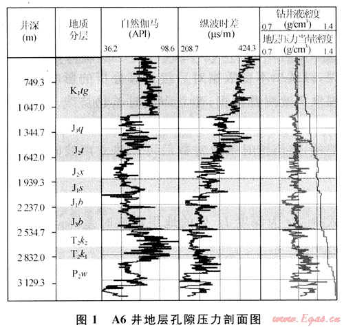 在整體把握準(zhǔn)噶爾盆地東部地區(qū)的地質(zhì)特性后,對(duì)相關(guān)測(cè)井?dāng)?shù)據(jù)資料進(jìn)行分析處理,應(yīng)用上述計(jì)算方法,對(duì)該地區(qū)A1井等6口井的地層壓力進(jìn)行了計(jì)算(表1),并繪制了A6井全井地層孔隙壓力剖面圖(圖1)。