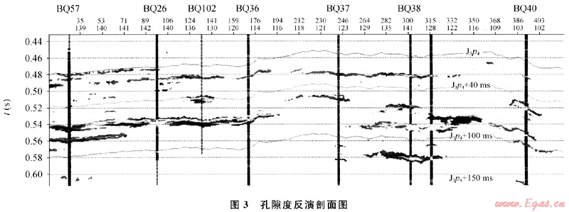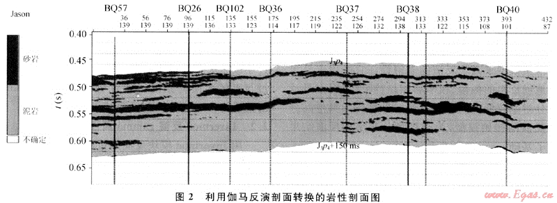 由于統(tǒng)計(jì)了多井點(diǎn)樣本數(shù)據(jù)的地質(zhì)、地震特性,在儲(chǔ)層屬性建模中進(jìn)行約束,這優(yōu)化了對(duì)儲(chǔ)層的模擬。從利用該模塊反演的過井Gamma剖面看,其整體面貌好,但個(gè)別井始終對(duì)應(yīng)不好(如BQ36井)。