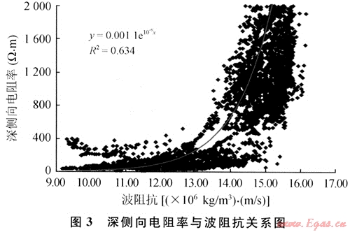 由圖3看出,區(qū)塊波阻抗與電阻率呈乘冪關(guān)系,波阻抗高值對應(yīng)電阻率高值,統(tǒng)計(jì)結(jié)果與地質(zhì)認(rèn)識(shí)吻合,擬合的關(guān)系式相關(guān)系數(shù)較高,可以滿足反演處理的要求。區(qū)塊波阻抗與RTC的統(tǒng)計(jì)關(guān)系不是很明顯,所以采用間接方式得到波阻抗與RTC的轉(zhuǎn)換關(guān)系。結(jié)果表明RTC反演與地質(zhì)情況吻合,擬合的相對關(guān)系式相關(guān)系數(shù)較好,完全能滿足反演處理的要求。