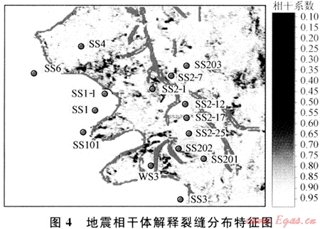 對區(qū)塊的三維地震資料進(jìn)行了沿層地震相干數(shù)據(jù)處理,可見相干系數(shù)低值分布特點(diǎn)與本區(qū)的斷裂和構(gòu)造分布密切相關(guān)。對于相干圖的解釋可分為兩個(gè)級(jí)別:相干值低,延伸較長呈條帶狀分布,則解釋為斷層;相干值較低,延伸較短,則解釋為裂縫。由相干處理合平面圖可以看出,相干系數(shù)低值帶沿?cái)嗔褞Х植迹呛陷^好(圖4)。