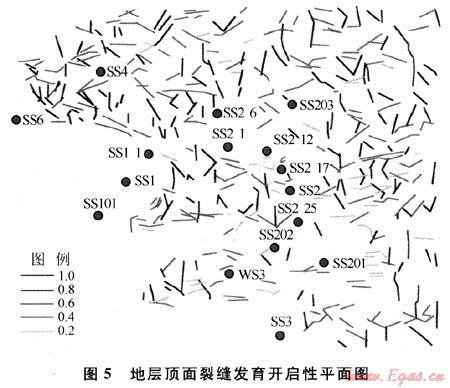 根據(jù)區(qū)塊的構(gòu)造發(fā)育史,營城組火成巖天然裂縫的主要形成時(shí)期為晚侏羅世沉積期以及白堊紀(jì)青山口組-姚家組沉積時(shí)期,對現(xiàn)今裂縫開啟性以及裂縫發(fā)育規(guī)模起決定作用的時(shí)期是青山口組-姚家組拉張應(yīng)力場沉積時(shí)期。依據(jù)構(gòu)造發(fā)育歷程,通過統(tǒng)計(jì)XMAC測井解釋,在營城組內(nèi)四期火成巖頂面構(gòu)造分析基礎(chǔ)上,作出了上述4個(gè)構(gòu)造層頂面地層應(yīng)變量及裂縫開啟度分布圖(圖5)。營城組火山巖以北西向和近南北向的兩組裂縫最為發(fā)育,裂縫密度較大且開啟性好,這與區(qū)內(nèi)斷裂發(fā)育的特點(diǎn)相吻合,說明了斷裂對裂縫發(fā)育及分布的控制作用比較大。單井在預(yù)測圖上統(tǒng)計(jì)預(yù)測的符合率達(dá)到94%,可見該方法在本區(qū)是有效的。
