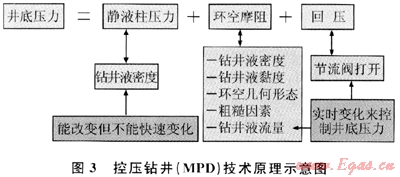 MPD主要是通過對回壓、流體密度、流體流變性、環(huán)空液位、水力摩阻和井眼幾何形態(tài)的綜合精確控制,使整個(gè)井筒的壓力精確的維持在地層孔隙壓力和破裂壓力之間,進(jìn)行平衡或近平衡鉆井,如圖3所示。