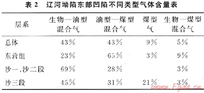 上式中V油、V煤分別代表混合氣中偏陸源油型氣和煤型氣的含量百分數(shù)。通過公式可計算得出東部凹陷不同層段的天然氣的混合比例(表2)。