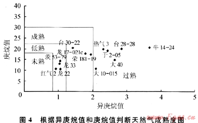 將據(jù)該區(qū)異庚烷值和庚烷值判斷的天然氣成熟度(圖4)