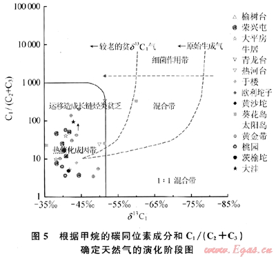根據(jù)甲烷碳同位素成分和C1/(C2+C3)也可以確定天然氣的成因(圖5)。