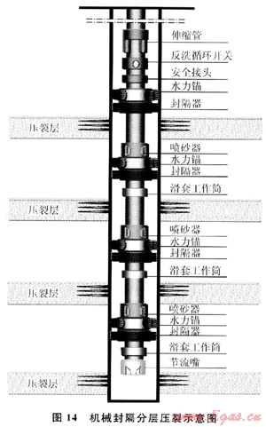 對于氣層多而薄,非均質性強的儲層:采用了分層壓裂改造的儲層改造思路,實現了不動管柱一次分壓4層的技術突破(圖14)。通過114口探井的應用,平均試氣產量提高3.74×104m3/d,已成為蘇里格氣田勘探開發(fā)的主體技術之一。