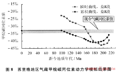 氣藏同位素動力學模擬實驗結果表明,累積甲烷碳同位素值曲線與現今氣藏同位素值范圍基本一致,同樣說明蘇里格地區(qū)天然氣藏主要為近源捕獲,并且是長期累積聚氣所形成的(圖8)。