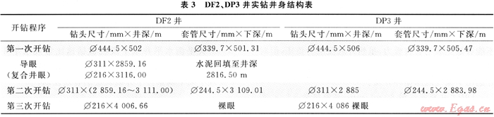 DF2、DP3井采用第三次開(kāi)鉆井身結(jié)構(gòu),Φ339.7mm表套進(jìn)入中下侏羅統(tǒng)直羅組,封住上部膠結(jié)強(qiáng)度低、疏松、易垮塌地層,第二次開(kāi)鉆采用Φ311mm鉆頭,下入Φ244.5mm技術(shù)套管封住造斜段。第三次開(kāi)鉆采用Φ215.6mm鉆頭,為下步完井方式的選擇留有余地,如果獲得理想的自然產(chǎn)能則裸眼完井,若自然產(chǎn)能低先進(jìn)行氣舉、解堵,解堵后仍不能達(dá)到配產(chǎn)要求,可以下5½″尾管射孔完井,對(duì)儲(chǔ)層實(shí)施壓裂改造[5]。這樣既降低了施工風(fēng)險(xiǎn),又避免了小井眼中實(shí)施壓裂改造在工具上的局限性。鉆井實(shí)踐結(jié)果表明,這種井身結(jié)構(gòu)是合理的,其結(jié)構(gòu)簡(jiǎn)單、施工方便,具有可操作性和經(jīng)濟(jì)性。DF2、DP3井實(shí)鉆井身結(jié)構(gòu)如表3所示。