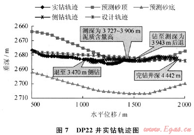 DP22井在水平段的氮氣泡沫欠平衡鉆進過程當中實現(xiàn)了隨鉆點火,火焰高4~6m,后效火焰高9~11m,油氣顯示非?;钴S。DP22井在井深3727~3906m井段伽馬值偏高,判斷為鉆遇泥巖夾層,后退至3470m處進行懸空下切側(cè)鉆,后鉆至井深4442m處完鉆,由于后退下切側(cè)鉆導致氮氣泡沫實鉆進尺超過1900m。在最后一趟鉆起鉆過程中出現(xiàn)了卡鉆事故。事故原因為沉沙卡鉆,最后一趟鉆總進尺為281.54m,平均機械鉆速為11.04m/h,在鉆井過程中伽馬值偏高,同時出口處沒有巖屑返出。圖7給出了DP22井氮氣泡沫欠平衡水平段實鉆軌跡。
