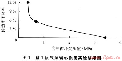 圖1給出了盒1段氣層巖心損害實驗結(jié)果,從圖1中可以確定出盒1段氣層欠平衡水平井的最佳欠壓值為3.4MPa,即在盒1段氣層實施欠平衡水平井的循環(huán)介質(zhì)當量循環(huán)密度需小于0.76g/cm3,滿足該條件的循環(huán)介質(zhì)只有氮氣和氮氣泡沫,但考慮到鉆井時產(chǎn)生的振動影響、電磁隨鉆測量系統(tǒng)的可靠性要求以及鉆頭的冷卻問題,決定選用可循環(huán)氮氣泡沫作為循環(huán)介質(zhì),其當量循環(huán)密度為0.2~0.5g/cm3,滿足了施工要求。