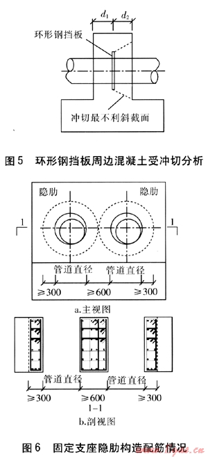 ② 管道穿過固定支座處,由于管道上環(huán)形鋼擋板對混凝土產生局部壓應力,宜在孔邊加設隱肋[5],且隱肋內的鋼筋總截面積不宜小于被切斷鋼筋截面積的1.5倍,并應配置箍筋,見圖6,圖中數(shù)值單位為mm。