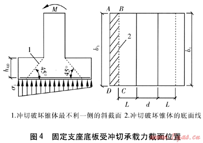 對固定支座矩形底板,應驗算擋板墻與底板交接處的受沖切承載力。固定支座底板受沖切承載力截面位置見圖4。