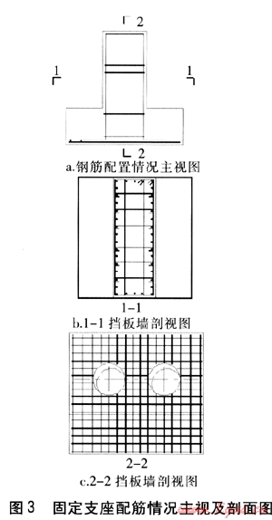 為了保證固定支座有能夠承受管道推力的足夠強度,需要在固定支座的擋板墻及底板內配置一定數(shù)量的鋼筋,見圖3。
