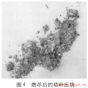 混燒不僅改善了燃煤的著火性能,還改善了主燃區(qū)燃料層內(nèi)空氣與燃料的混合。秸稈壓塊在冷態(tài)情況下是致密的塊狀結構,受熱時揮發(fā)分析出,自身將成為疏松的孔狀結構,且膨脹、體積增大。由圖3可以觀察到燃料層表層的體積膨脹后的秸稈壓塊。燃盡后的秸稈壓塊見圖4,其結構是疏松多孔狀的。