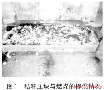 與煤混燒的是花生秧秸稈壓塊,其形狀為長方體,尺寸為30mm×30mm×70mm,運輸過程造成少量壓塊破碎成小塊,但粉末狀顆粒所占比例可忽略。由于成型過程中添加劑的影響,秸稈壓塊中灰的質(zhì)量分數(shù)約15%,低位發(fā)熱量約14562kJ/kg?;鞜^程中,秸稈壓塊與燃煤的摻混比例(質(zhì)量比)為20%~30%。采用人工摻混,煤斗內(nèi)的混合情況見圖1,兩者混合比較均勻。